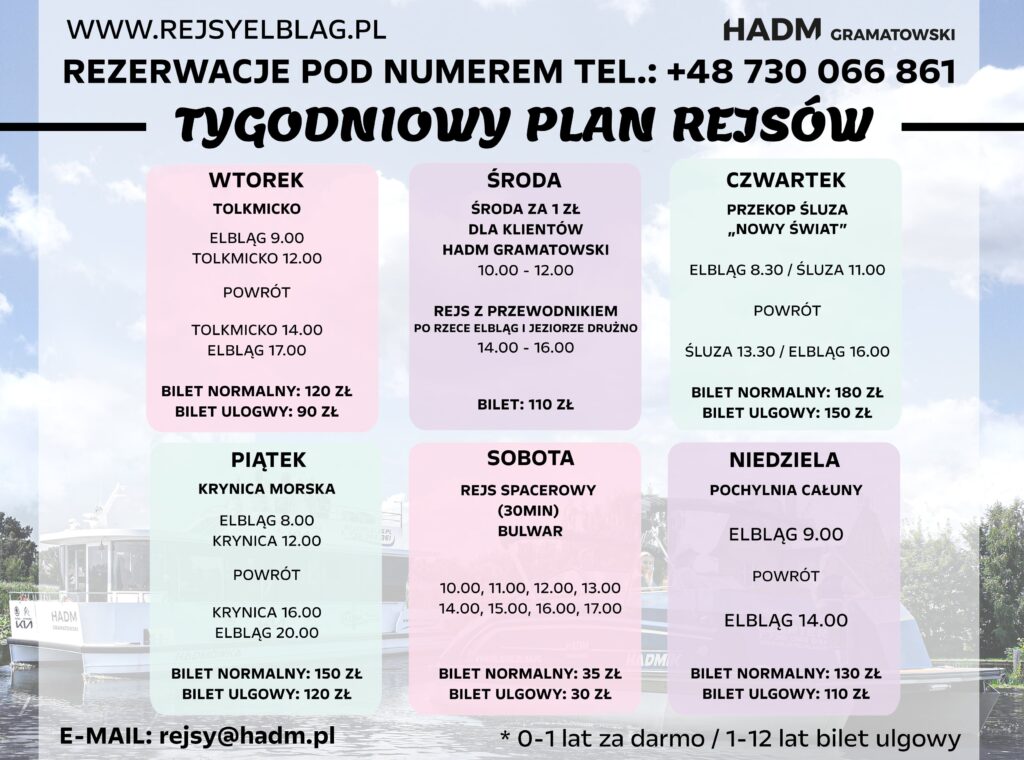 Rejsy zaczynają się m.in. Buczyńcu, Ostródzie i Elblągu. Wśród oferowanych tras rejsów pojawiają się m.in.: