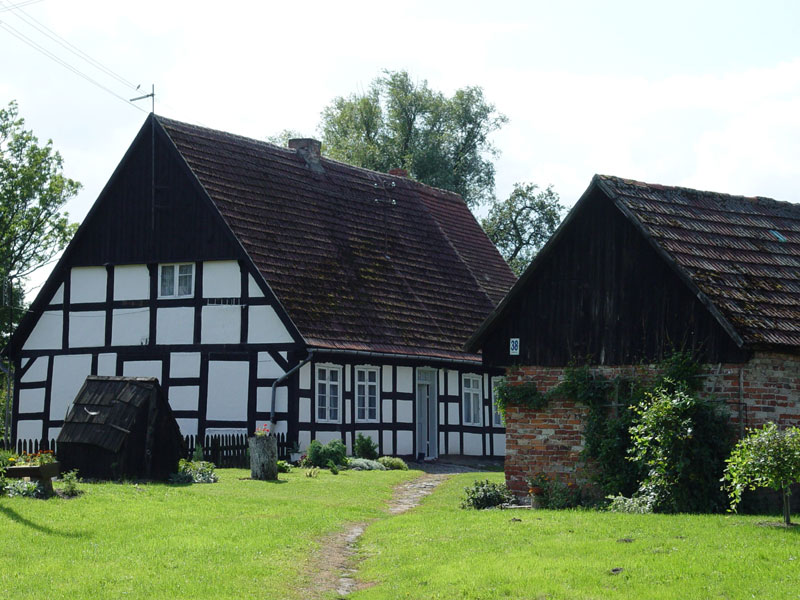 Budynki nadające baśniowy charakter wsi wznoszono metodą szachulcowo-ryglową. Metoda budowania typowa dla Pomorza. Polegała ona na tym, że najpierw stawiano drewnianą konstrukcję ryglową, następnie przestrzenie między belkami wypełniano gliną zmieszaną ze słomą lub trocinami. Belki ryglowe smarowano dziegciem nadając im ciemny , czarny kolor. Po wypełnieniu przestrzeni belki wyraźnie odbijały kolorystyką od ścian nadając budynkom charakterystyczny wygląd przypominający kratkę.